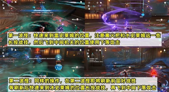 第三阶段:第一波怪时,迅速移动至右侧雷史莱姆的位置,注意与旁边的火把和水史莱姆保持距离,长按战技后飞至中间的机关位置下落攻击(只有对应元素的攻击才能触发机关),这样丘丘游侠会被削弱,使用技能和普攻可以迅速击败。