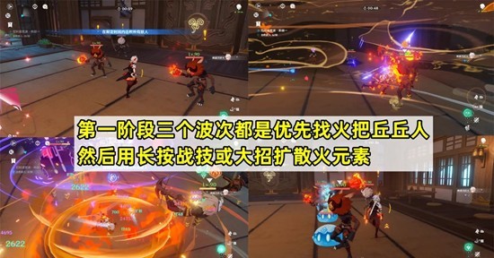 第一阶段:面对三个波次的敌人,首先找到火把丘丘人,接着使用长按战技或大招扩散火元素,可以轻松清理所有怪物。