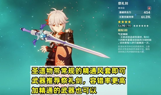装备推荐:圣遗物选择标准的精通风套;武器方面,推荐使用祭礼剑,其他增加精通的武器也是不错的选择,祭礼剑的容错率更高,充能速度也更快。